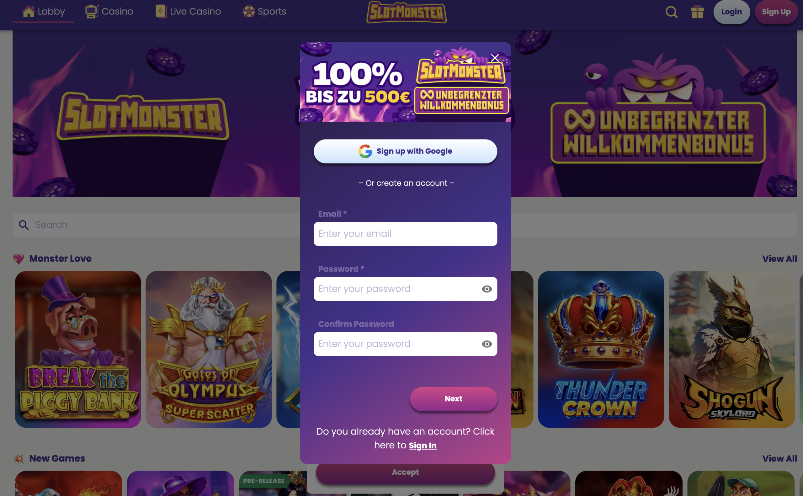 | Slotmonster | #1 | Apostas em direto e levantamentos express | 100% até 200 € |